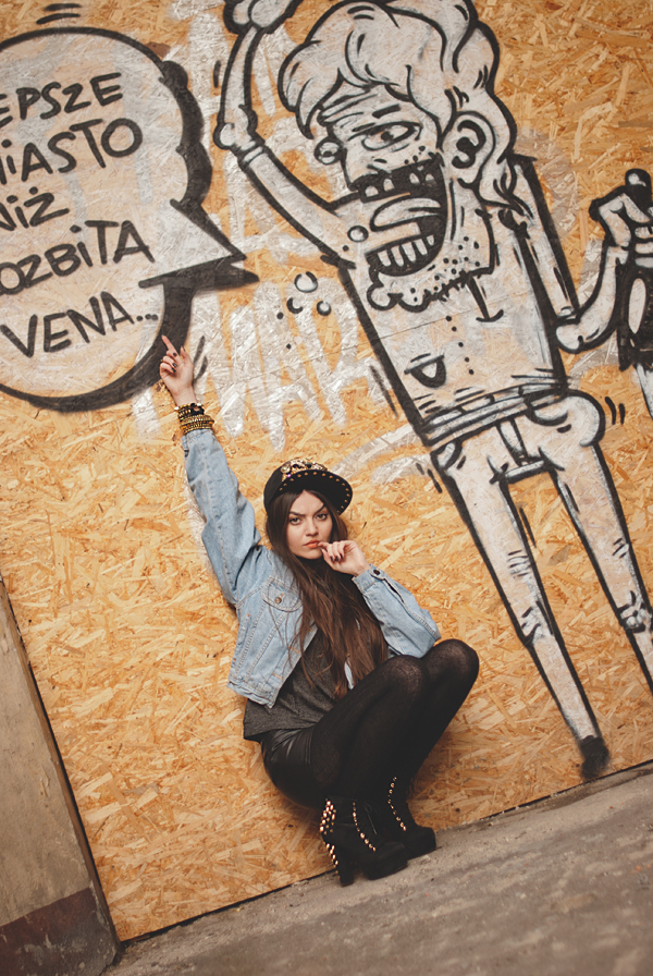 Pomysł na look zrodził się już w momencie zamawiania czapki. Co gorsza - nie jeden! Uwielbiam i jednocześnie nienawidzę. Jak zdecydować się na najlepszą kombinację, kiedy w głowie aż huczy od stylizacyjnej wariacji. Rzeczą oczywistą jest, że można kombinować na wiele sposobów i pokazywać to światu. Jednak jeśli coś jest już raz widziane - w pewnym sensie pozbawia Was efektu zaskoczenia. Ale do rzeczy. Poszły konie po betonie. Abyście mogły zazdrościć mi długich, pięknych nóg - postawiłam na czerń od stóp do ... pasa. Wciągnęłam jeszcze grafitowy, nakrapiany swetr i dżinsową kurtkę. Jako że lubuję się w ćwiekach - całość okrasiłam dodatkami właśnie w tej estetyce. Powstał glam grunge.