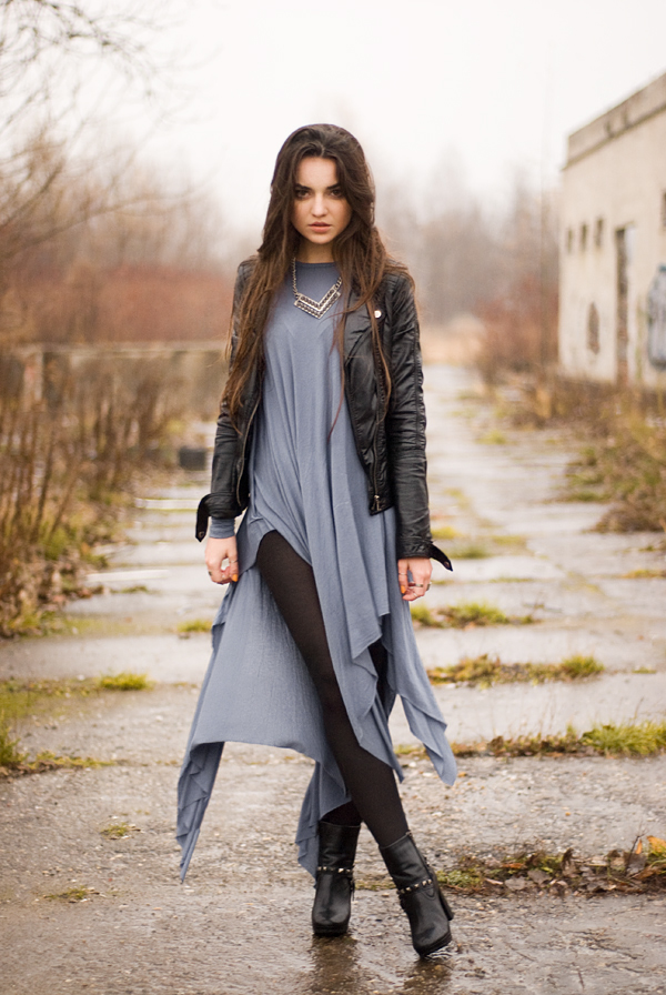 Ciężkie buty (Pepe Jeans) i dodatki (H&M) zestawione z czarną, skórzaną ramoneską (House) i drapowaną (a wręcz poszarpaną) sukienką (Front Row Shop), tworzą iście rockowy zestaw. Dla tych, które lubią nonszalancję i luźny, miejski styl.