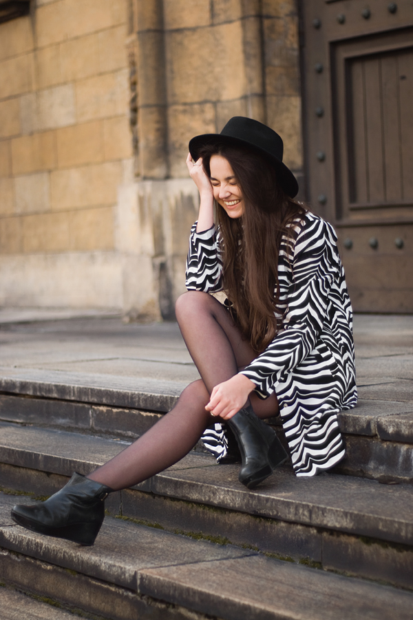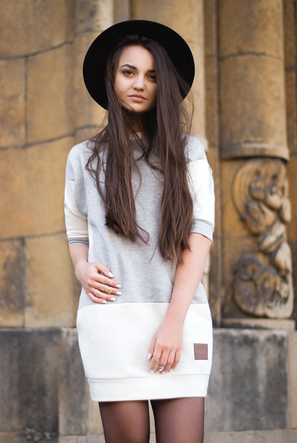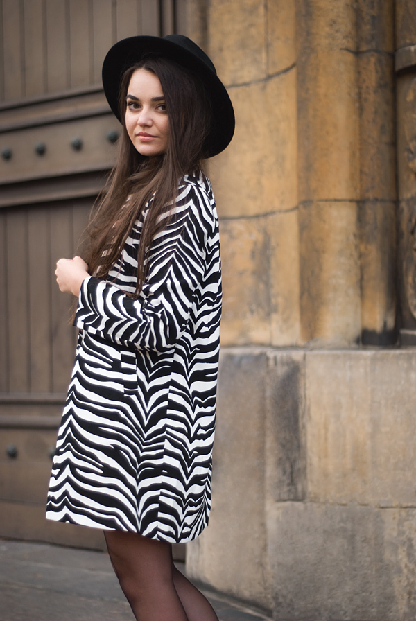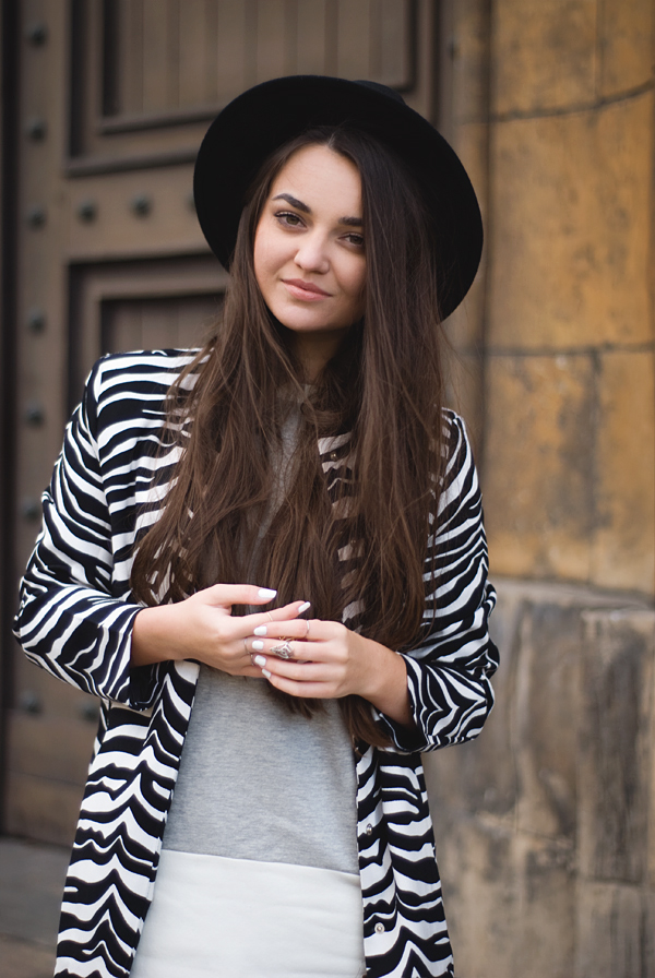 Set: Dziś postawiłam na streetwear, przełamany zwierzęcymi akcentami w postaci lekkiego, jesiennego płaszcza (ZARA - old collection). Oszczędność dodatków. Kapelusz (Seeberger) i proste buty (Vagabond). Najciekawszym elementem stylizacji nie jest dla mnie przyciągający i skupiający na sobie całą uwagę płaszcz, ale dresowa, minimalistyczna sukienka (Keyce). Wybrałam tę w odcieniach szarości i bieli.
